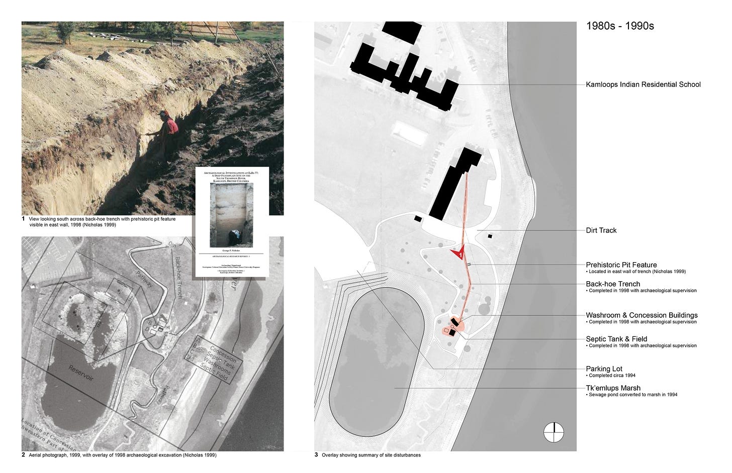 By 1998, the former apple orchard had become part of the Secwepemc Museum and Heritage Park. Archaeologists from Simon Fraser University were on hand to monitor construction of park facilities, including a concession, washrooms, and various underground utilities. A back-hoe trench 4 feet wide x 5 feet deep and 260 feet long was dug through the orchard for a water line. At least one ancient pit feature, containing animal bones, shells and other artifacts was located about 2 feet below grade (Nicholas 1999). No graves were discovered.