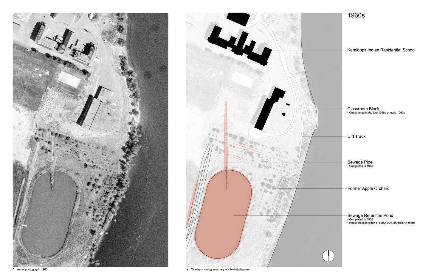 In 1958, after at least a decade of alleged burials, more than 30% (100,000 square feet) of the former apple orchard was excavated for a sewage retention pond. A large sewer main was also trenched through the orchard from the northwest. No graves were discovered.