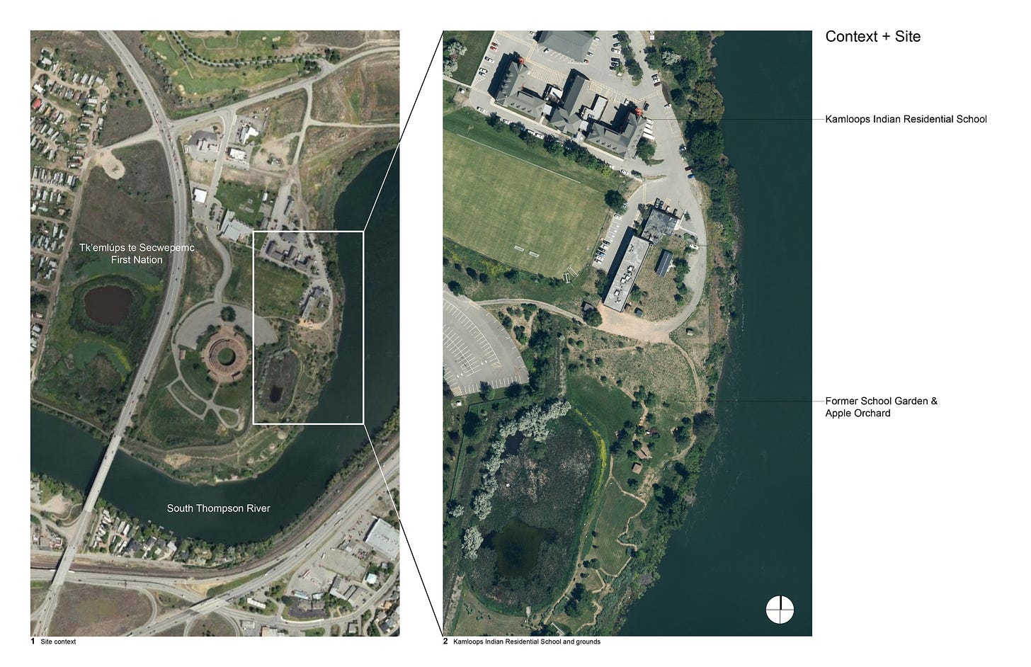 The apple orchard is located about 500 feet southeast of the former Kamloops Indian Residential School. It sits near a prehistoric housepit village, atop an extensive shell midden and ancient refuse pits [HR: perhaps going back centuries]. The area is considered archaeologically significant and has been the subject of assessments, test holes and excavations from 1983 to 2004.